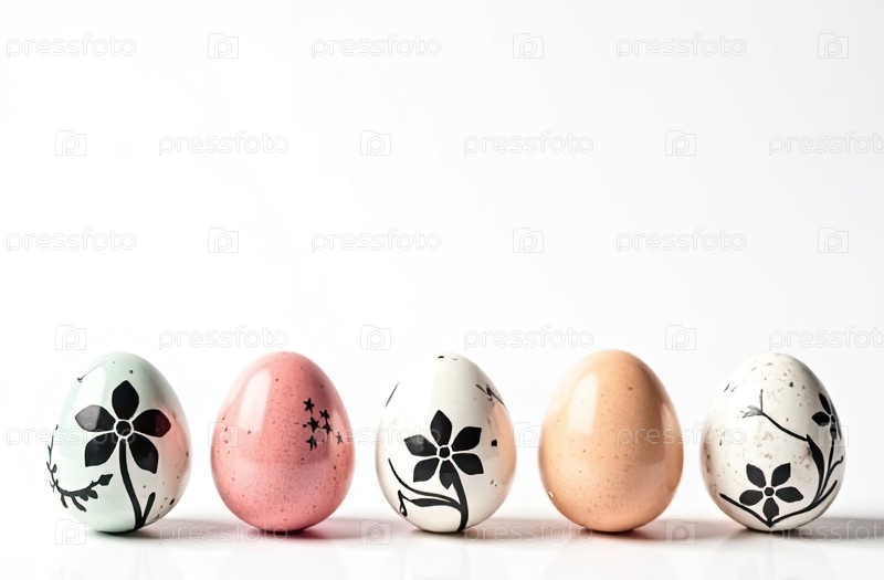 Внизу изображения пять яиц со свободным пространством сверху для текста, творческий цветочный черный рисунок на цветах-яйцах, белый фон. Пасхальный баннер с пробелом для текста. ИИ генерируется