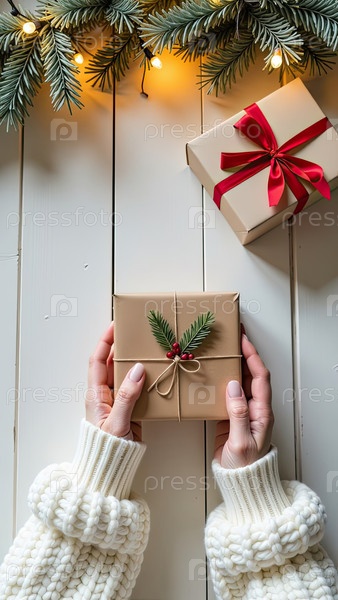 Упаковать подарок на Рождество и Новый год в крафт-бумаге, привязанный веревкой с луком с рождественским декором на белом столовом столе, натуральный декор. Праздничное настроение. Flatlay, background, copy space. AI generated