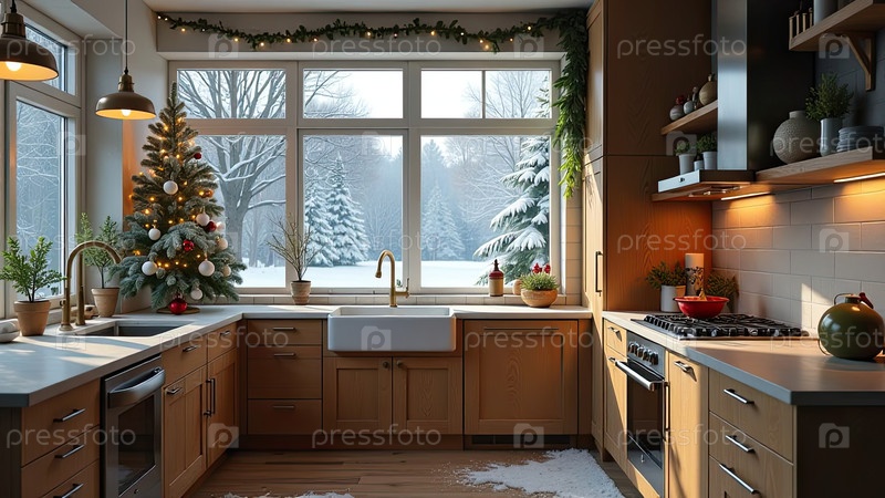 Верхний интерьер уютной современной рождественской кухни, новогоднее настроение, подготовка к празднику, посуда. Рождественский декор современной кухни, снег снаружи окна. ИИ генерируется