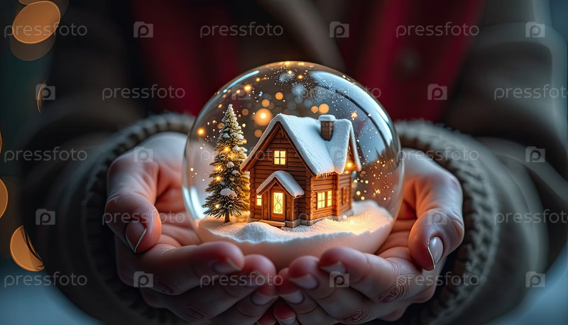 Магический стеклянный шар с крошечным современным домом и снегом внутри в уютной руке с рождественской елкой с гирляндами на фоне. страхование, ипотека, покупка недвижимости. ИИ генерируется
