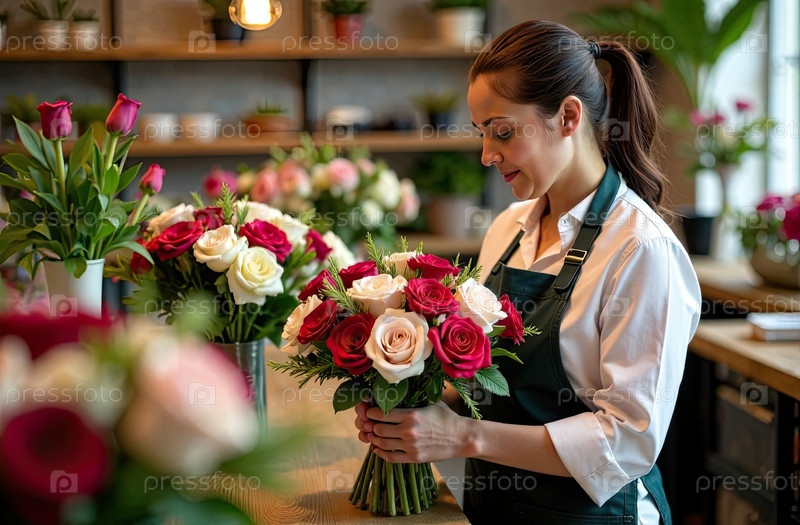 Букет роз и весенних цветов в руках флориста в интерьере цветочного магазина, доставка на праздник.Весна, 8 марта, женский день, день рождения.Искусственный интеллект генерирует