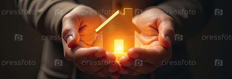 Золото светящийся символ уютного дома В ладонях рук с золотым блеском. Недвижимость, риэлтор, ипотека, страхование, бронирование, изоляция, мечта о собственном доме. ИИ генерируется