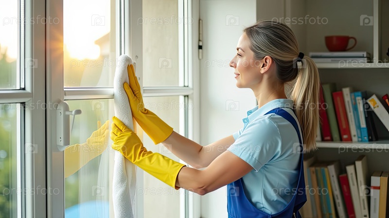 Молодая женщина в синем фартуке и желтых резиновых перчатках с тряпкой в руке моет окно во внутренней части дома с книжной полкой, услугами по уборке окон, уборка дома