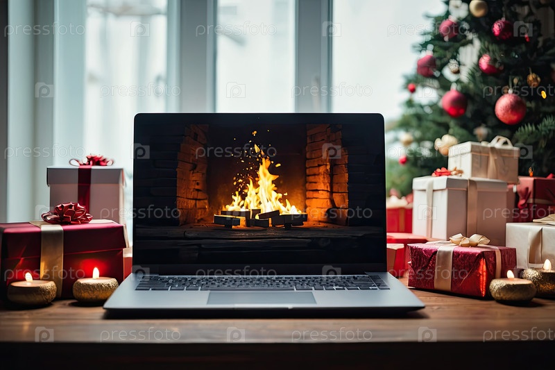 Ноутбук с рождественскими обоями на столе в офисе в торговом центре Рождественский декор с сумками, торговыми пакетами, посылками, Черной пятницей, Новым годом