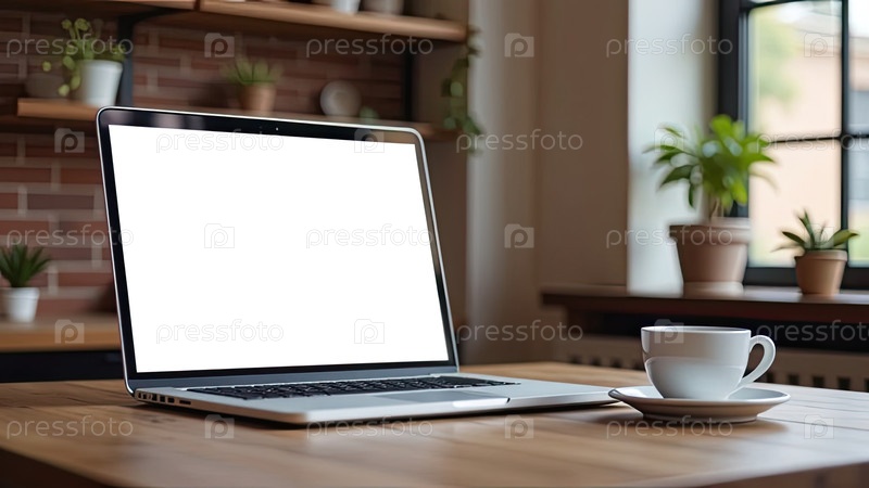 Ноутбук с белым экраном макет на фоне кафе в стиле лофт со стаканкой кофе на столе. удаленная работа, интернет, покупки. ИИ генерируется