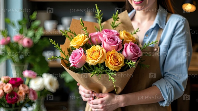 Букет роз и весенних цветов в руках флориста, упакованный в крафт-бумагу в интерьере цветочного магазина, доставка на праздник.Весна, 8 марта, женский день, день рождения. ИИ сгенерировано