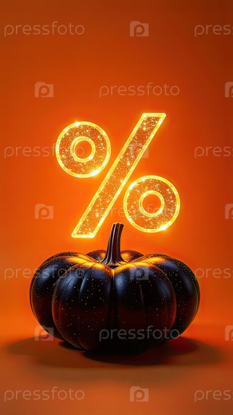 Золотой светящийся процентный знак с тыквой на оранжевом фоне со свободным местом для текста. Осенние распродажи и скидки, баннер Harvest и Halloween, флаер с пространством для копирования. ИИ генерируется