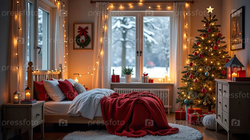 Уютная спальня с кроватью у окна с рождественским декором и елкой, теплыми гирляндами света и свечами - вид изнутри зимой и снегом. Отпразднуйте Рождество и Новый год, рождественское настроение. ИИ генерируется