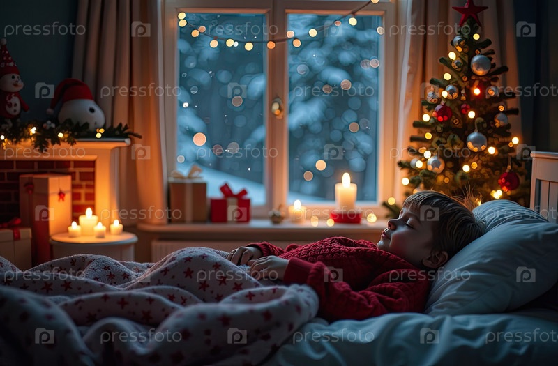 Ребенок спит в кровати в уютной спальне с рождественской елкой и теплыми гирляндами света и свечами - вид из окна зимой и снегом