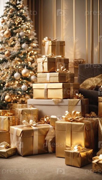 Рождественский фон с подарочными коробками с луками в ярких золотых тонах, боке и фейри-светом, рождественская елка во внутреннем интерьере дома. Праздничное настроение Рождество и Новый год, открытка. ИИ генерируется