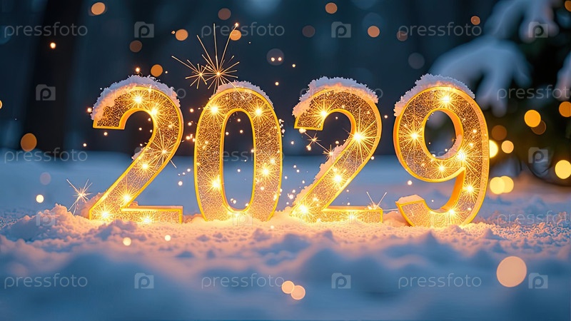 Прозрачные золотые светящиеся числа 2029 на снежном фоне Нового года с золотистыми гирляндами боке, секины, звезды, снег, блеск. Поздравления, открытка. Календарь, обложка. AI generated
