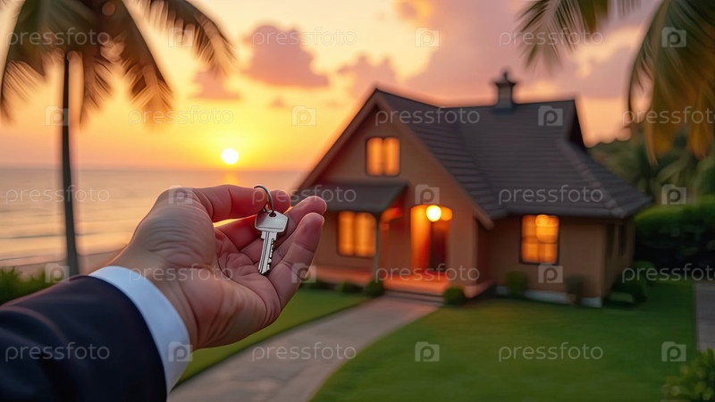 Рука риэлтора с ключами от дома для пляжного отдыха в жарких тропиках с пальмами. Резервации гостиниц, бронирование, переезд в новый дом, ипотека, аренда и покупка недвижимости. ИИ генерируется