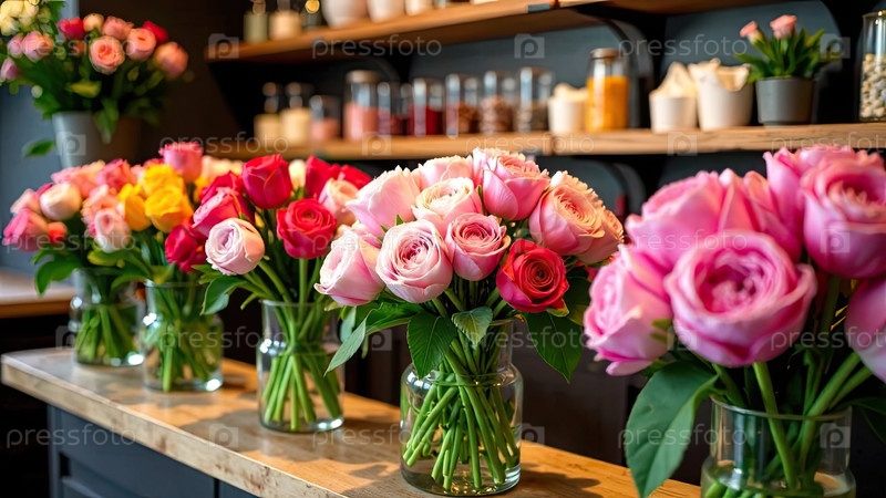 Красочные букеты роз в цветочном магазине - свежерезанные цветки на складе и стеллажи для продажи, доставка к празднику. весна 8 марта, женский день, день рождения. ИИ генерируется
