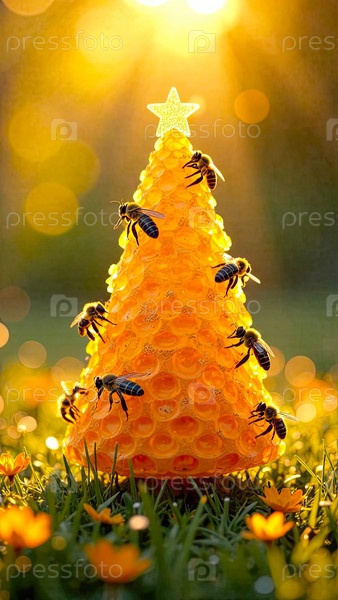 Мед в сосудах в форме конуса рождественской елки с пчелами на летнем поле под солнечным светом.Пчеловодство, Рождество, Новый год.Искусственный интеллект создан
