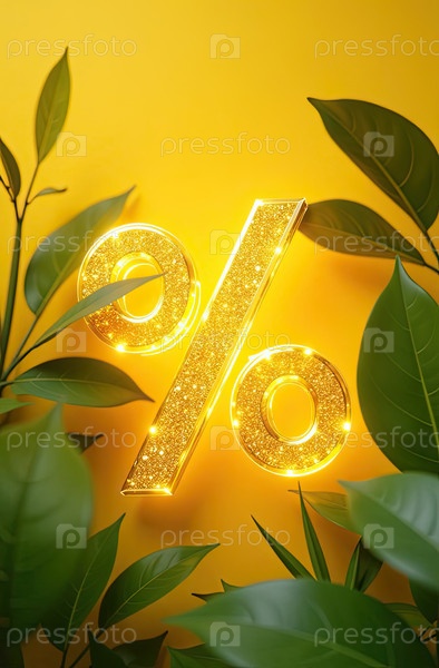Яркий золотой процентный знак на желтом фоне с пальмами и тропическими растениями. жаркая летняя распродажа и скидки, горящий туристический баннер, флаер. ИИ генерируется