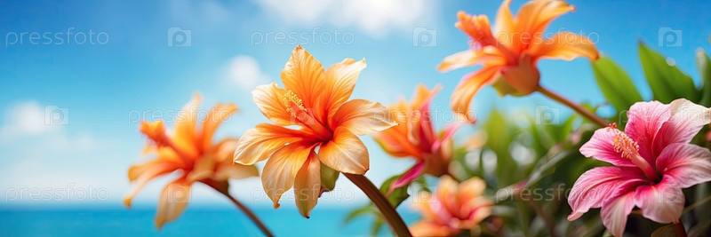 Летняя цветовая аранжировка с цветами плюмерии на тропическом пляже, голубой водой, пальмовыми листьями и копировальным пространством