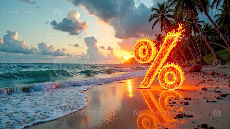 Огненный горящий знак процент на берегу моря с тропическими пальмами в свете солнца, фон заката океана. жаркая летняя распродажа и скидки, горящий тур-баннер, флаер. ИИ генерируется