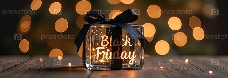 Неоновые светящиеся золотые буквы "Черная пятница" на прозрачной подарочной коробке с праздничным фоном золотистого бока. витрина магазина для Черной пятницы, распродажи, скидки, листовки, созданные ИИ