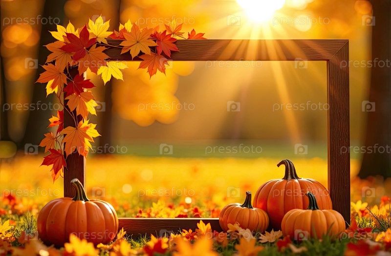 Рама украшена желтыми кленовыми листьями на осеннем фоне с тыквой в лучах солнца. баннер урожая и Хэллоуин, флаер с копировальным пространством. ИИ генерируется