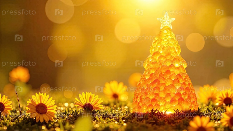Мед в сосудах в форме конуса рождественской елки с пчелами на летнем поле под солнечным светом.Пчеловодство, Рождество, Новый год.Искусственный интеллект создан