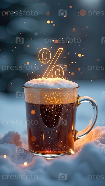 Неон светящийся золотой процентный знак на кружке с горячим кофейным напитком, паромом, блеском и снегом. зимние распродажи и жаркие скидки, Черная пятница, Новый год, Рождество. баннер, флаер с копировальным пространством. AI generated