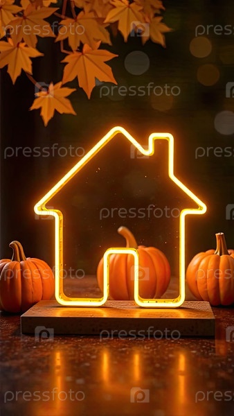 Золотой неон светящийся логотип Крошечный дом с тыквами и желтыми кленовыми листьями на осеннем фоне. Недвижимость, дача, летний домик, ипотека, страхование, бронирование, строительство, изоляция. ИИ генерируется