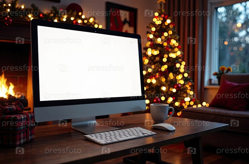 Монитор домашнего компьютера с белым экраном макет на столе в уютном домашнем офисе рождественского декора, елки и горящего камина с гирляндами