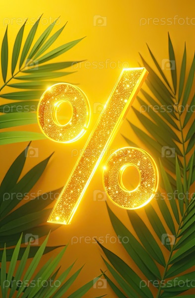 Яркий золотой процентный знак на желтом фоне с пальмами и тропическими растениями. жаркая летняя распродажа и скидки, горящий туристический баннер, флаер. ИИ генерируется