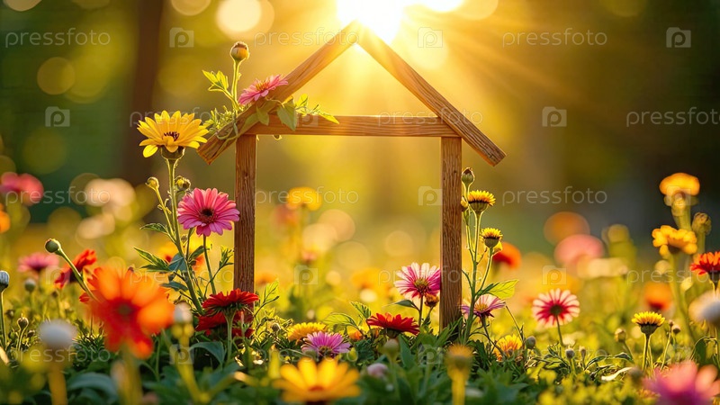 Крошечный экологический каркасный дом теплица в солнечных лучах, с летними цветами на солнечном фоне в поле. недвижимость, дача, летний дом, ипотека, страхование, бронирование, строительство, изоляция. ИИ генерируется