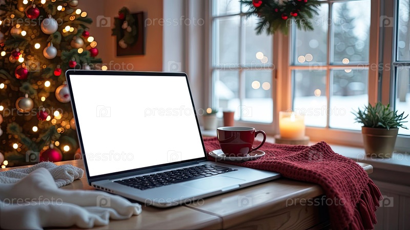 Ноутбук с белым экраном макет на столе в уютном домашнем офисе рождественского декора в стиле лофт