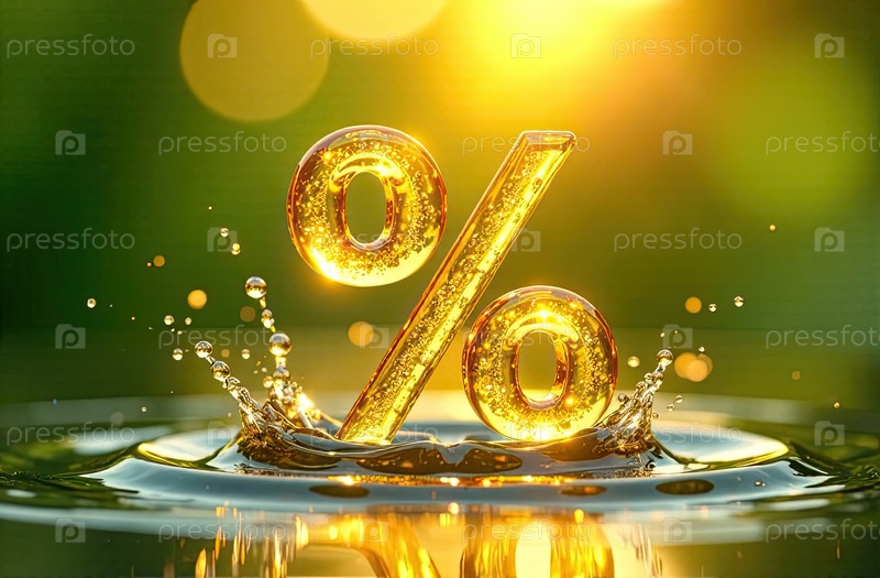 Светящийся золотой процентный знак в освежающем брызге воды над водой. жаркие летние распродажи и скидки, горящие баннеры туров, листовки. ИИ генерируется
