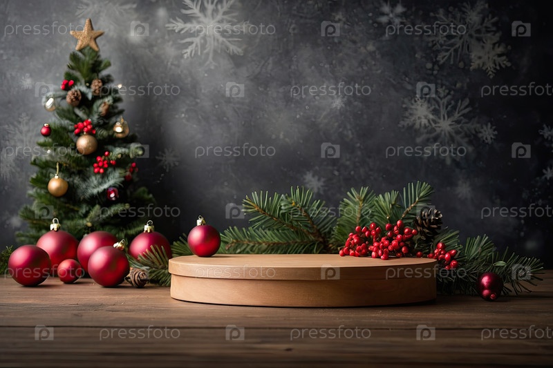 Пустая подиумная площадка для демонстрации продукта, дисплейный монтаж с рождественским декором, боке, секины и фейры. Копирование пространства, Рождество и Новый год. ИИ генерируется