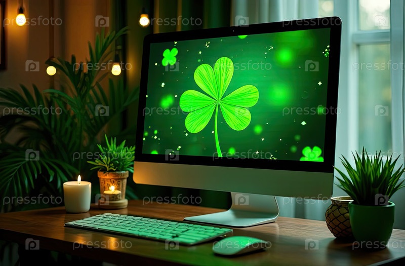 Ноутбук с зеленым клевером на экране в волшебном декоре ко Дню Святого Патрика. Сезонная дистанционная работа, интернет, рождественская карточка, шопинг, удача, зеленый дом. ИИ генерируется