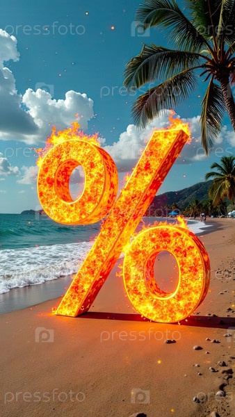 Огненный горящий знак процент на берегу моря с тропическими пальмами в свете солнца, фон заката океана. жаркая летняя распродажа и скидки, горящий тур-баннер, флаер. ИИ генерируется