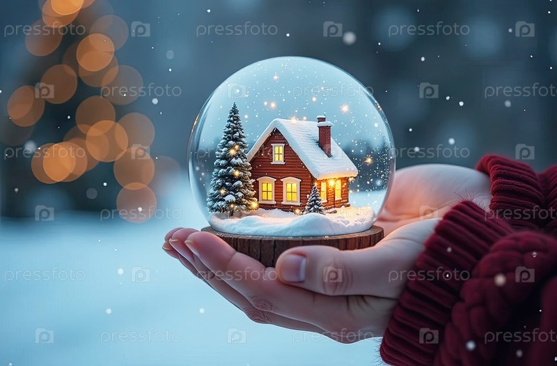 Магический стеклянный шар с крошечным современным домом и снегом внутри в уютной руке с рождественской елкой с гирляндами на фоне. страхование, ипотека, покупка недвижимости. ИИ генерируется