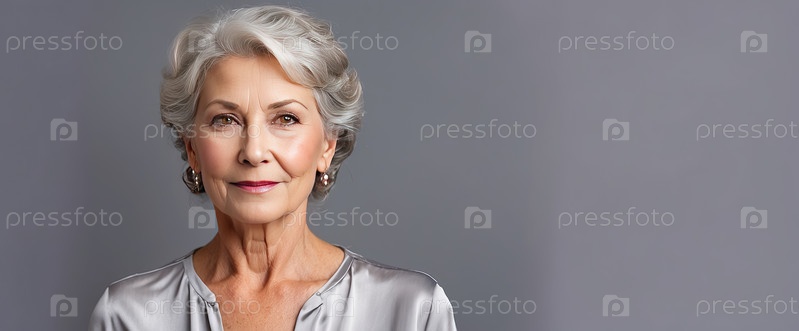 Пожилая женщина с светло-серыми волосами в серебряной блузке, мягко улыбающаяся перед серым фоном, студийный портрет, положительное старение, элегантная уверенность, изящный стиль