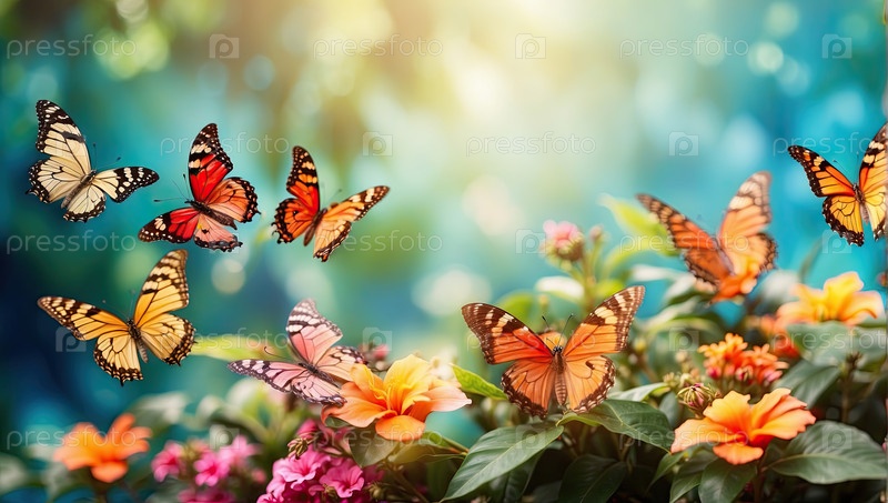 Богатая тропическая граница с бабочками и цветами, летние листья, зеленый мечтательный фон, пустая зона копирования