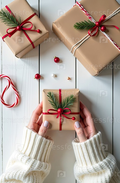Упаковать подарок на Рождество и Новый год в крафт-бумаге, привязанный веревкой с луком с рождественским декором на белом столовом столе, натуральный декор. Праздничное настроение. Flatlay, background, copy space. AI generated