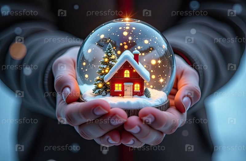 Магический стеклянный шар с крошечным современным домом и снегом внутри в уютной руке с рождественской елкой с гирляндами на фоне. страхование, ипотека, покупка недвижимости. ИИ генерируется