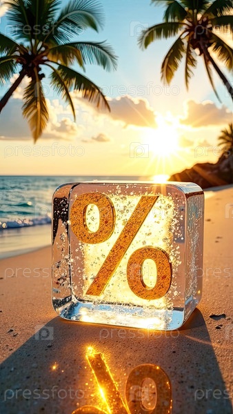 Неон светящийся золотой процентный знак в кубике льда на берегу моря с тропическими пальмами при солнечном свете, туристический фон. Горячая летняя распродажа и скидки, горячий баннер тура, флаер. ИИ генерируется
