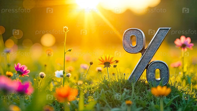 Процентный знак в солнечных лучах, украшен летними цветами. Летняя распродажа и скидки, экология, чистая природа, баннер летнего времени, флаер с копировальным пространством. ИИ генерируется