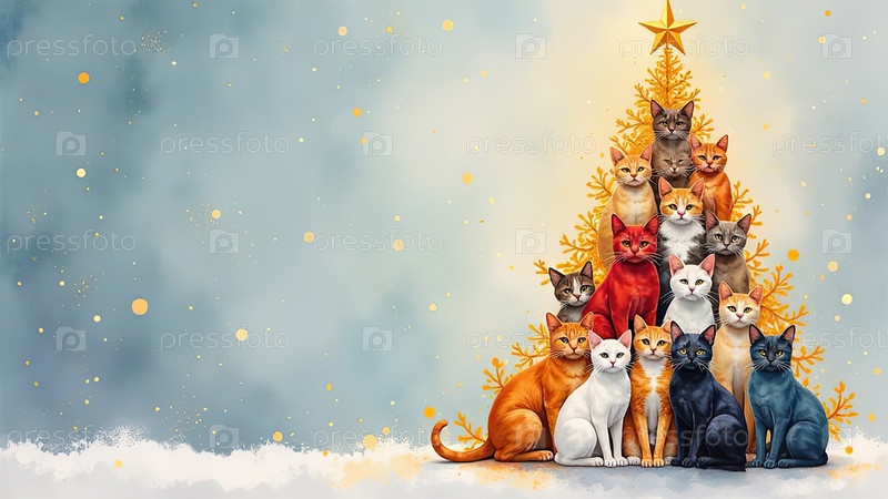 Акварельная рождественская елка из кошек, сделанная на праздничном фоне с блеском, многоцветные сотни кошек складываются в форме высокой рождественской елки с золотыми светящимися гирляндными огнями