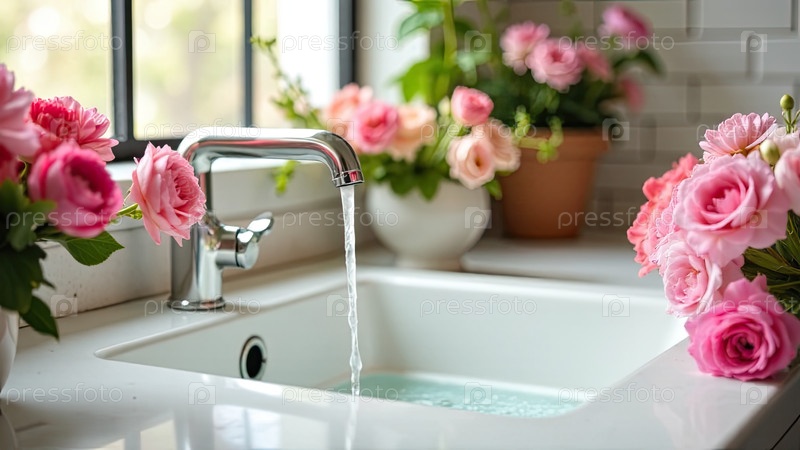 Ближайшая вода течет из крана в большую белую раковину цветочного магазина, окруженную массивом цветов. Цветочный бизнес, свежерезанные цветы, 8 марта, весна, день рождения. ИИ генерируется