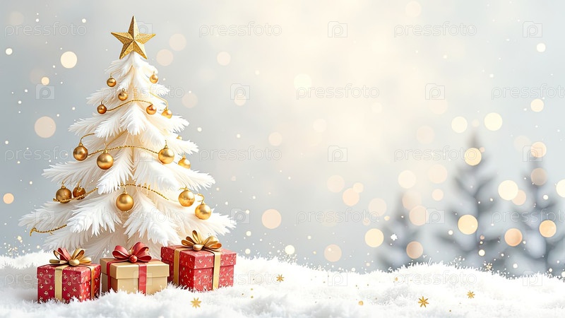 Акварельная белая и золотая рождественская елка и коробки для подарков на сияющем фоне. поздравительная карточка на Рождество и Новый год с копировальным пространством. созданный ИИ