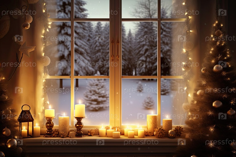 Внутреннее уютное окно с рождественским декором и теплым светом - вид изнутри зимой и снегом. отпразднуйте Рождество и Новый год, елку, боке, снег. ИИ генерируется