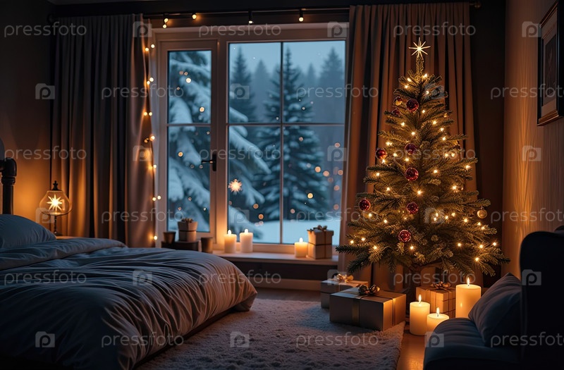 Уютная спальня с кроватью у окна с рождественским декором и елкой, теплыми гирляндами света и свечами - вид изнутри зимой и снегом. Отпразднуйте Рождество и Новый год, рождественское настроение. ИИ генерируется