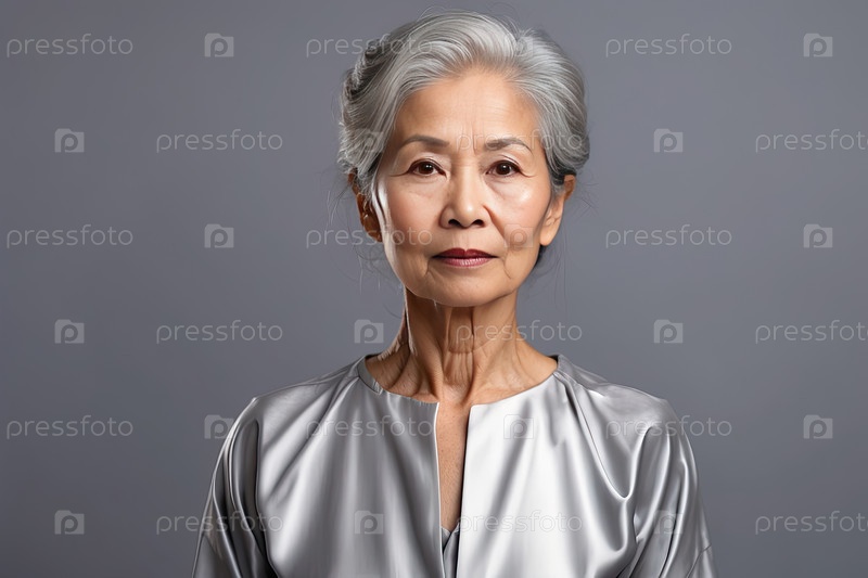 Пожилая женщина с седыми волосами в элегантном серебряном наряде позирует со спокойным выражением лица в студии, зрелой уверенностью, грациозным старением, вневременной концепцией красоты