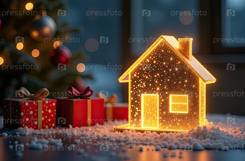 Прозрачное золото светящийся символ дома и коробка для подарков под елкой на рождественском фоне с золотым блеском