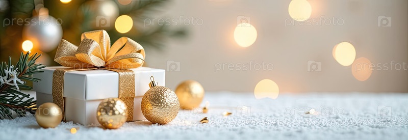 Рождественский фон с белыми коробками для подарков со золотыми лучами, светящимся боке и блеском. Праздничное настроение Карта на Рождество и Новый год с копировальным пространством. ИИ генерируется