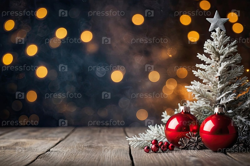 Рождественская открытка с кописпейсом на уютном деревянном столе с елкой, рождественскими шарами, свечами, конусами и блестками